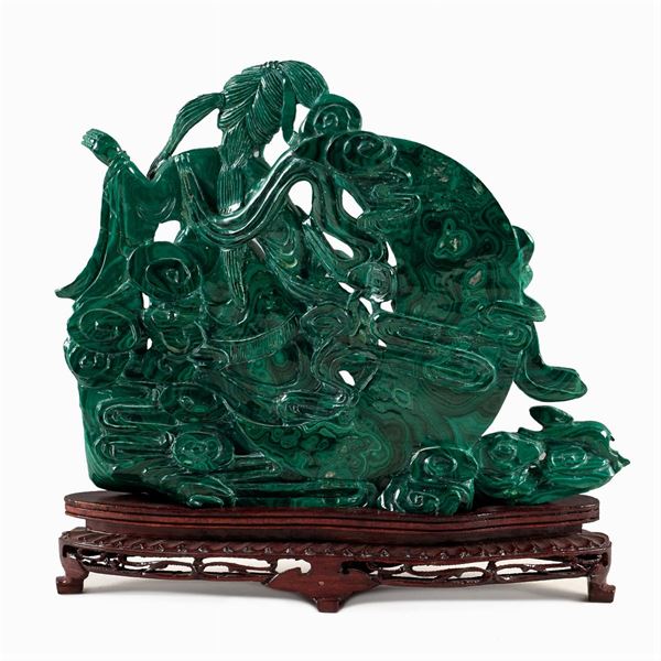 20x25 cm.modeled as a Guanyin resting on a wooden base, slight defects