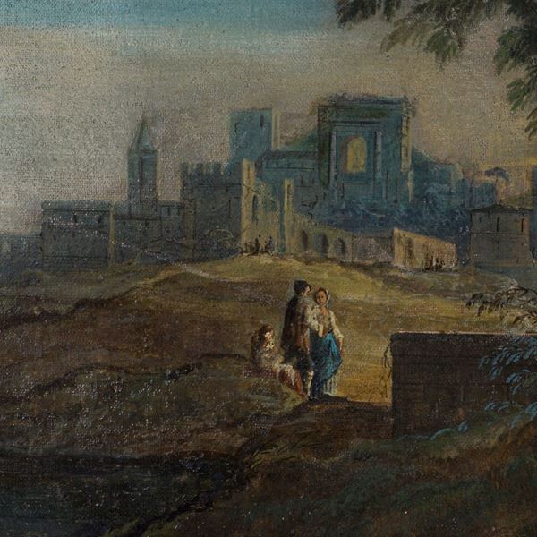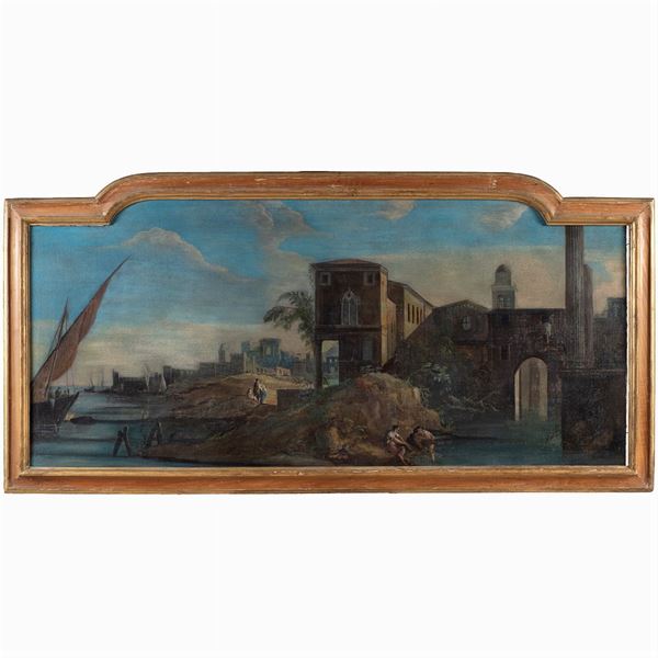 80x176 cm."Marine landscape with city on the background", oil on canvas, framed