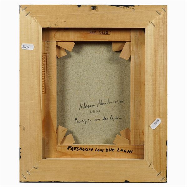 "Paesaggio con due laghi", 2000, oil on canvas, signed, dated and titled on the back, framed