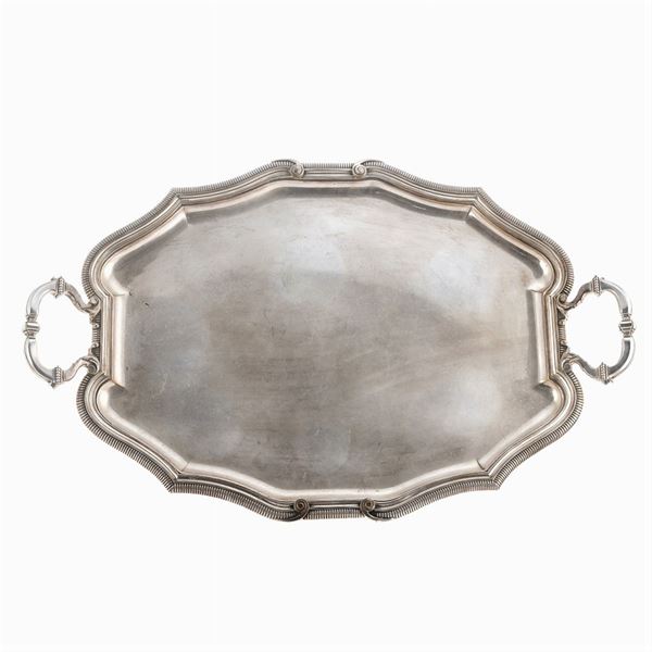 45x73x46 cm.marks of J. Emile Puriforcat, shaped profiles and wooden handles, comprising of: a samovar, a teapot, a coffee pot, a chocolate pot, two sugar bowls, a milk jug, and a large tray with two handles in silver-plated metal of coeval manufacture, weight 7.160 gr.