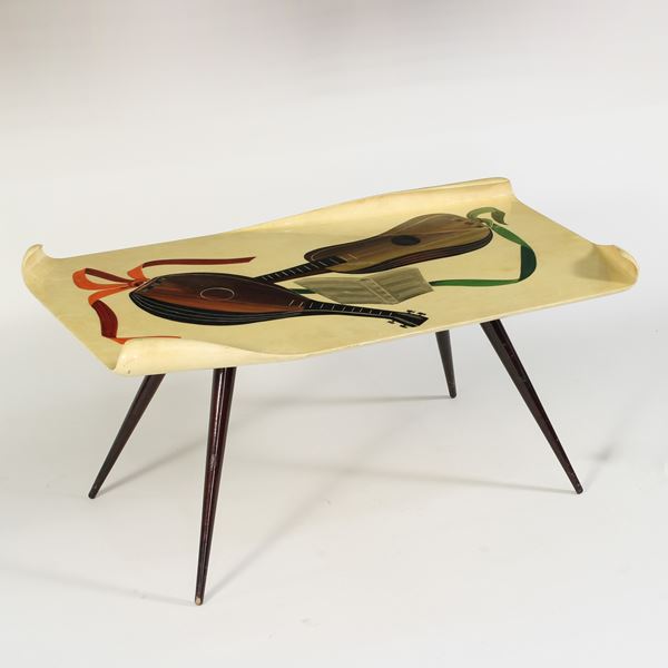 45x92x51.5cm.low wooden table, top covered in colored parchment and decorated with musical instruments, book and red and green ribbon, manufacturer's label