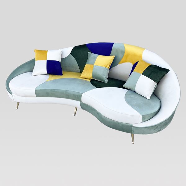 83x240x112cm.curved sofa in brass and upholstered fabric