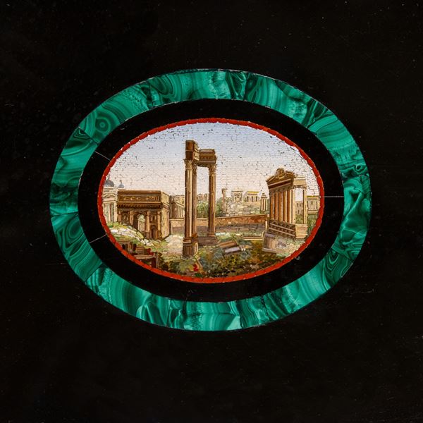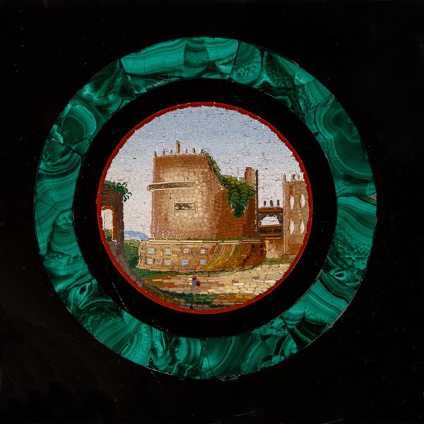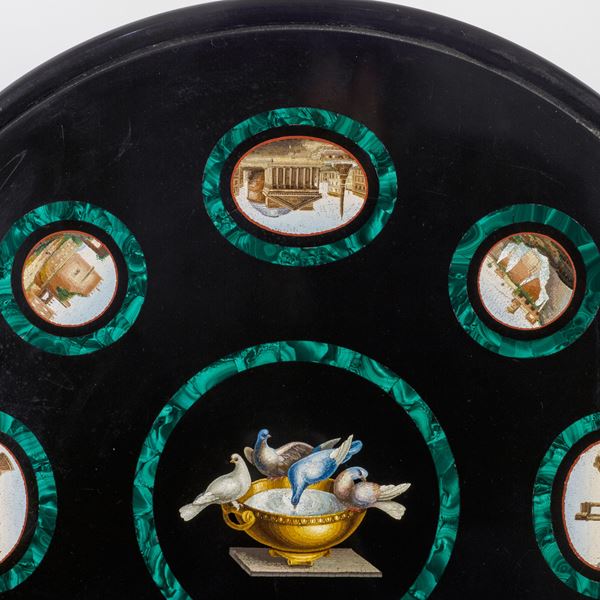 d. 56cms.circular shape depicting the Colosseum, St. Peter's Square, the Imperial Forums, the Arch of Trajan, the Pantheon, the Triton Fountain and the Temple of Hercules Victor, the Mausoleum of Cecilia Metella, the Tivoli Waterfalls and centered by the Colombe di Pliny, within malachite reserves