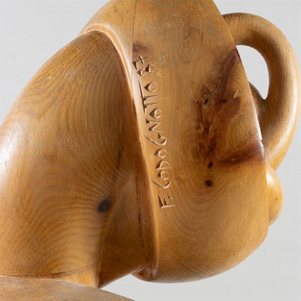 47x25cm."Maternità", 1987, wood sculpture, signed and dated, resting on a square base