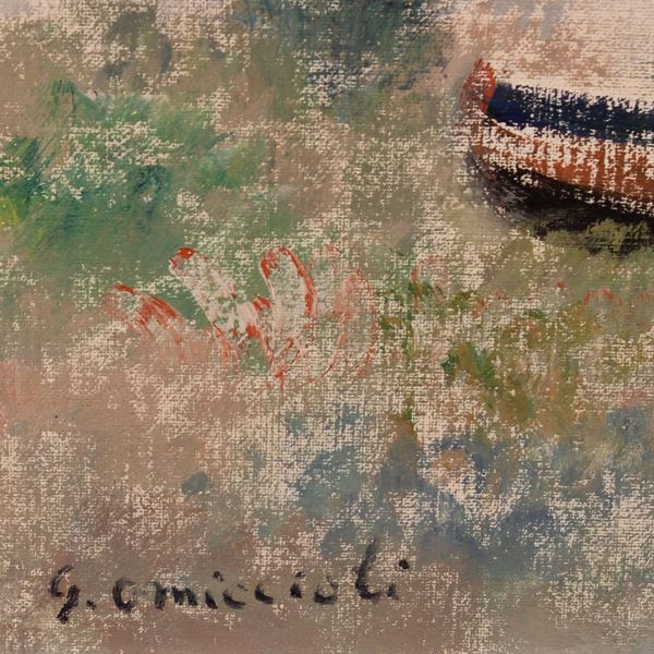 50x60cm."Boat on the beach", oil on cardboard, signed lower left, framed