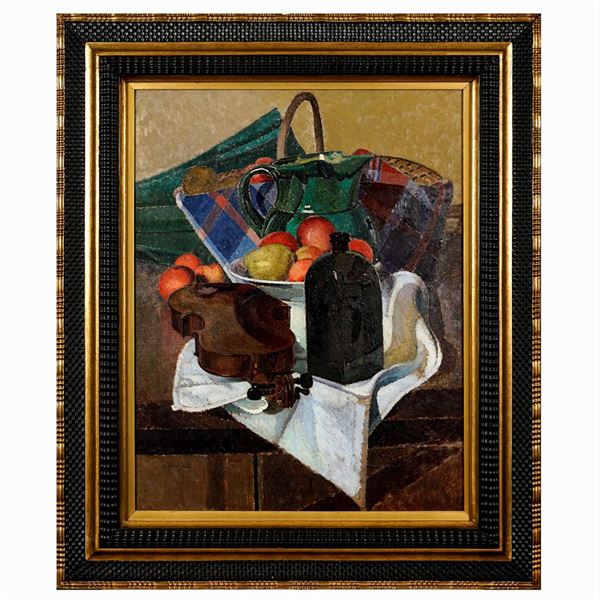 65x51 cm."Natura morta con frutta, brocca e violino", 1928 circa, oil on canvas, signed lower left. Work registered at the Istituto Matteucci, Viareggio with the n. 415574, authentic on photograph fated 16/01/2015.