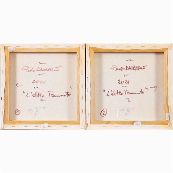 30x30cm."L'altro tramonto 1-2", 2021,  pair of acrylics on canvas, signed, dated and titled on the back