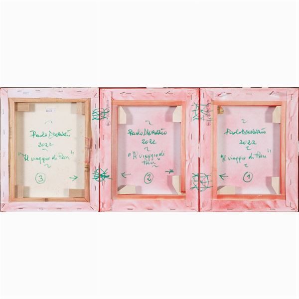 30x72.5cm."Il viaggio di Pan 1-2-3", 2022 triptych on mixed media on canvas, signed, dated and titled on the reverse, framed