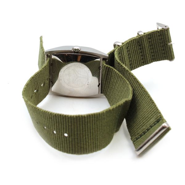 in steel, square case 33x36 mm. silvered dial with indexes, day and date display at 3 o'clock, mechanical movement with automatic winding, fabric bracelet with metal buckle