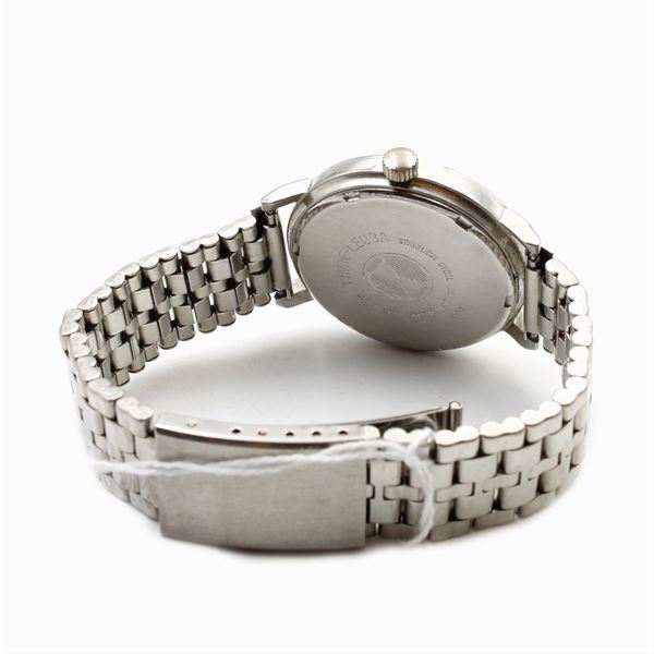 in chromed steel, 35 mm round case. blue dial with indexes, date display at 3 o'clock, mechanical movement with manual winding, steel bracelet with folding clasp
