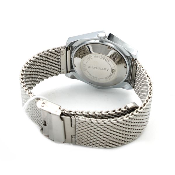 in chromed steel, hexagonal case 41x39 mm. fume pink dial with indexes, date display at 3 o'clock, mechanical movement with automatic winding, steel bracelet with sliding buckle