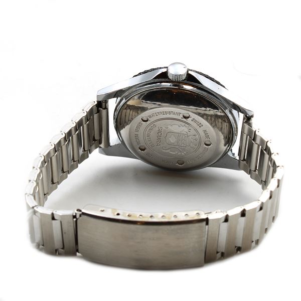 in steel, 38mm round case. black dial with Arabic numerals and indexes, date display at 3 o'clock, center seconds counter, mechanical movement with automatic winding, steel bracelet with deployant clasp