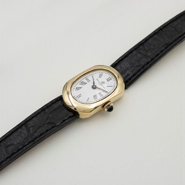 in 18kt yellow gold, ref. 3372272 - 38216, oval case 21x17 mm. white dial with Roman numerals, sapphire crown, mechanical movement with manual winding, caliber 550, leather strap with gold metal buckle, signed case, dial and movement