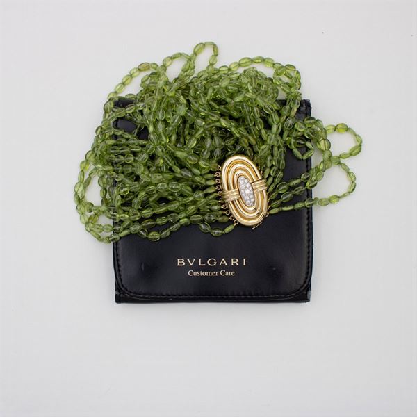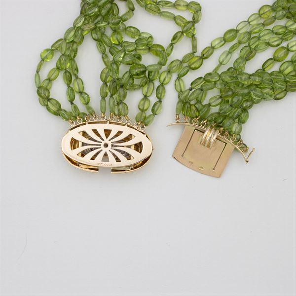 weight 148 g.composed of 10 gradation peridot threads joined by a 18kt yellow gold clasp and brilliant cut diamonds circa 0.50 ct, length 45 cm.
