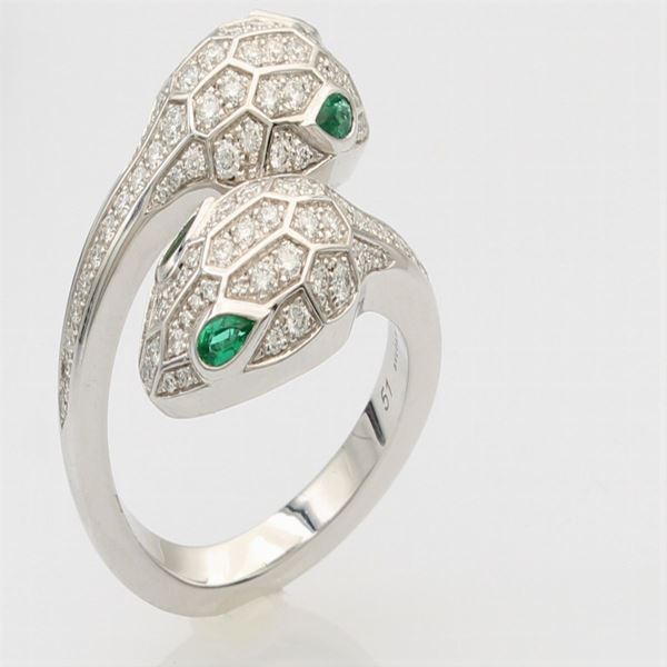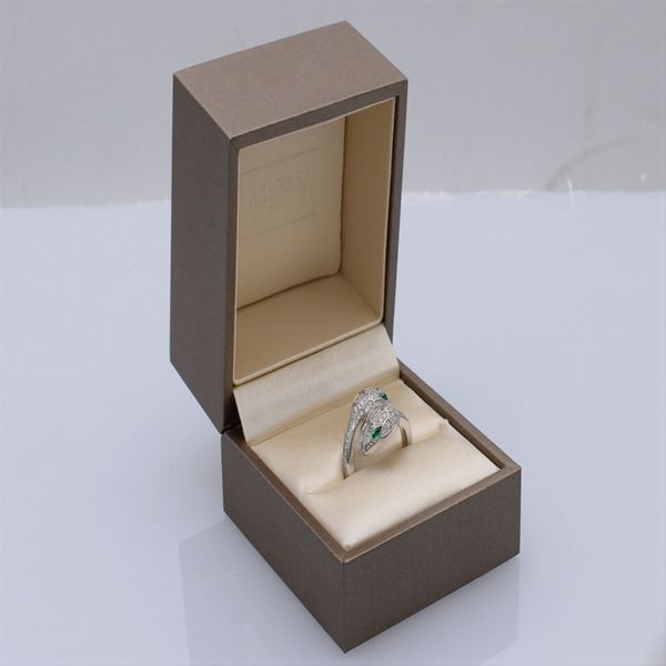 weight 9 g.in 18kt white gold brilliant cut diamonds circa 0.56 ct, eyes with pear cut emeralds, size 11, complete with box and warranty documents