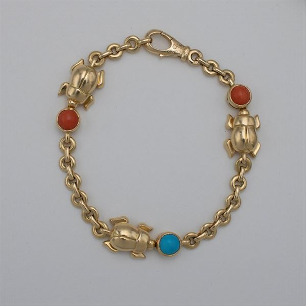 weight 24 g.in 18kt yellow gold, turquoises and coral, length 19 cm.