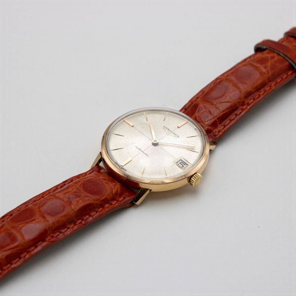 in 18kt yellow gold, ref. 7497, 34 mm round case. silver dial with golden indexes, date display at 3 o'clock, signs of wear, mechanical movement with automatic winding, caliber 355, leather strap with metal buckle