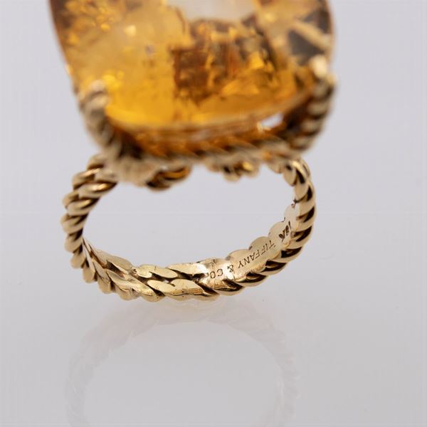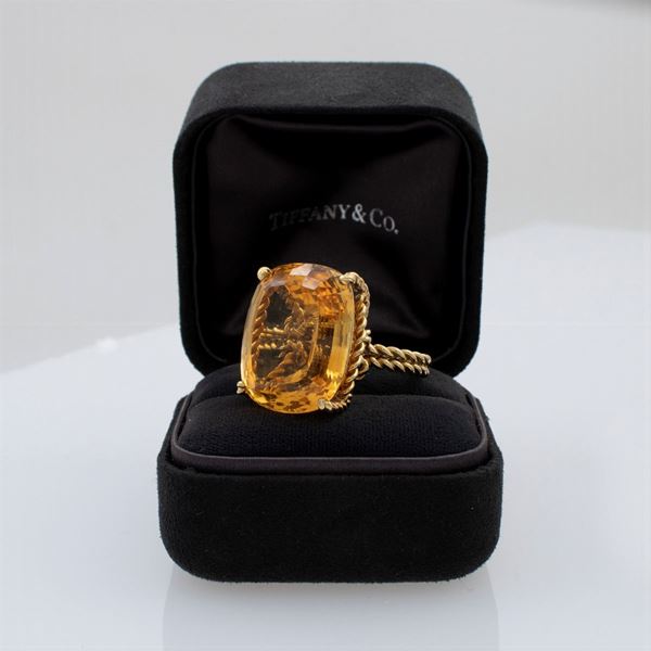 weight 25 g.in 18kt yellow gold with a large oval briolet cut citrine, complete with box, size 19