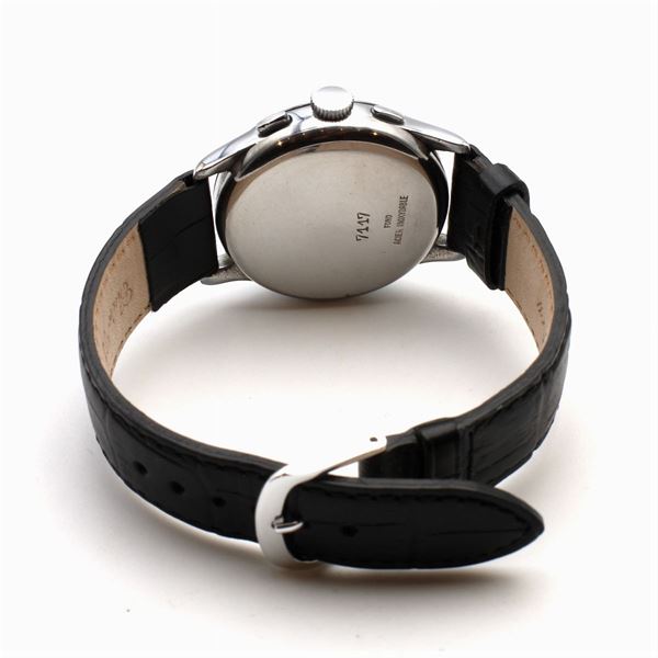 in chromed steel, 34 mm round case. silvered dial with Arabic numerals and indexes, tachymetre and telemetre scale, two subsidiary dials for counter, mechanical movement with manual winding, leather strap with metal buckle