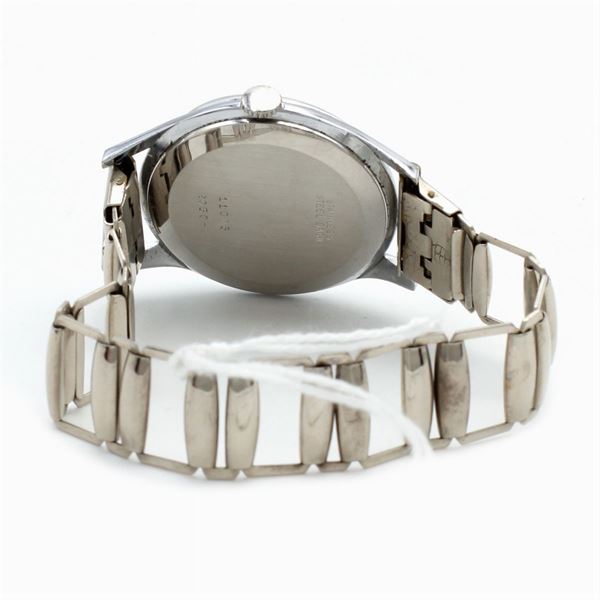in steel, 34 mm round case. cream dial with golden Arabic numerals and indexes, second counter at 6 o'clock, mechanical movement with manual winding, vintage steel military bracelet