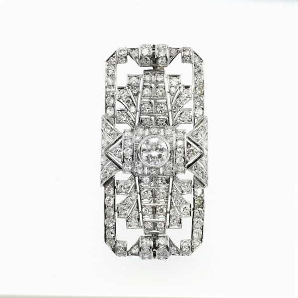 weight 17 gr.brilliant cut, one diamond circa 1 ct surrounded by brilliant cut diamonds circa 3.50 ct, one stone missing, dimensions 5.5x2.8 cm.