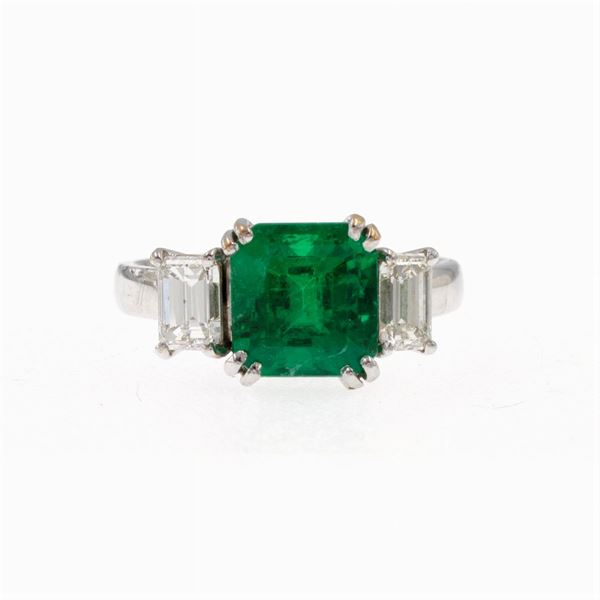 weight 5 gr.octagonal stepped cut of circa 2.22 ct, no artificial treatments, on the sides two carré-cut diamonds circa 0.90 ct, size 14, complete with gemological certificate