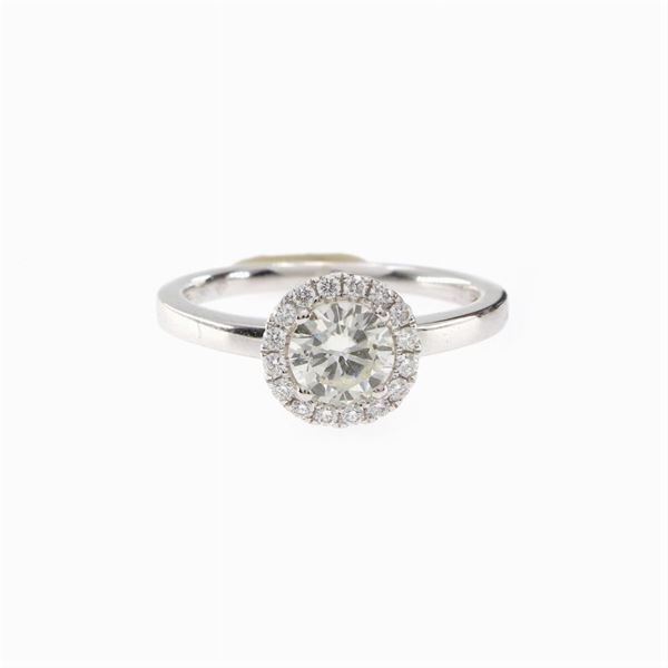 weight 3 gr.brilliant cut diamond circa 0.62 ct surrounded by brilliant cut diamonds circa 0.25 ct, size 12