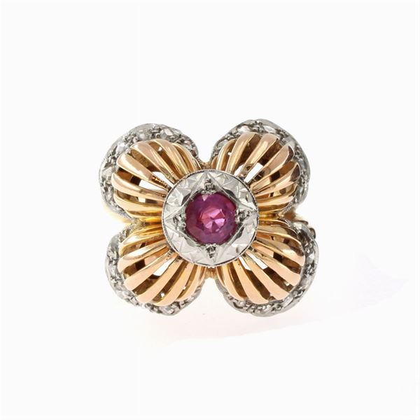 weight 15 gr.centered by a round ruby and diamond roses, size 16