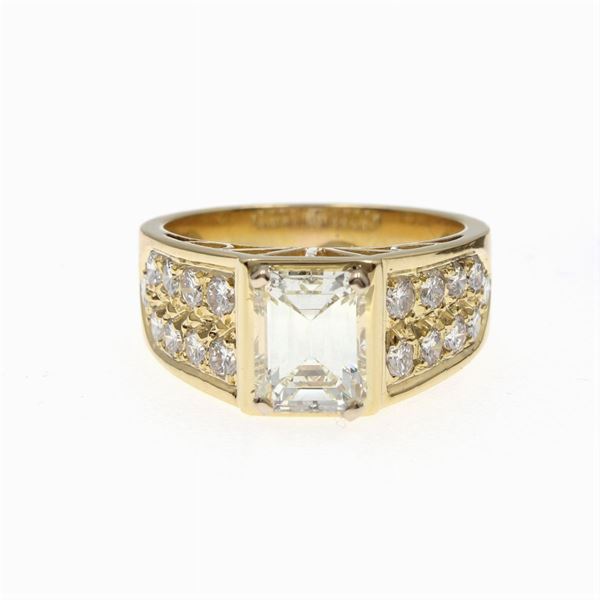 weight 6 g.octagonal stepped cut, K color- SI1 clarity, surrounded by brilliant cut diamonds of circa 0.50 ct, size 12, complete with gemological certificate
