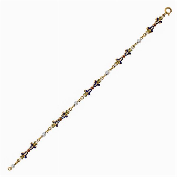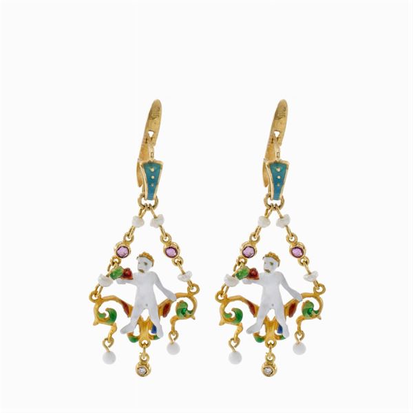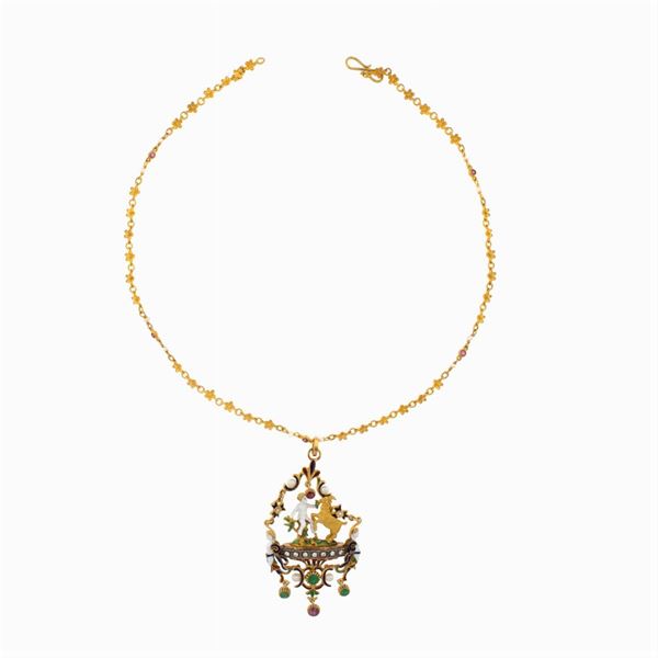 weight 65 gr.in 18kt yellow gold and polychrome enamel, embellished with brilliant-cut diamonds set on silver, emeralds, round rubies and pearls, comprising a pendant size 7.5x4 cm. complete with necklace length 44 cm. - bracelet length 19cm. - pendant earrings 4.5x2 cm. slight defects