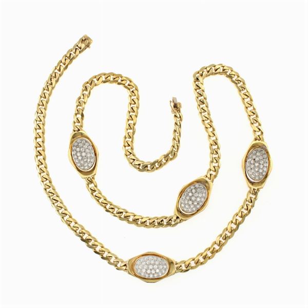 weight 161 gr.in 18kt yellow gold alternating with four geometric elements in yellow gold and brilliant-cut diamonds circa 5 ct, length 80 cm.