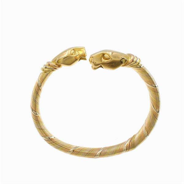 weight 50 gr.in 18kt yellow and white gold, three-color gold terminals with panther heads, diameter 6.5 cm. complete with fabric case