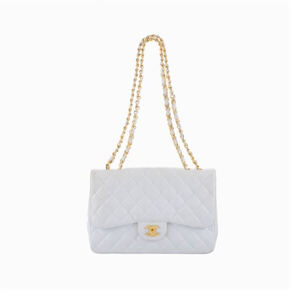 33x23x9 cm.white and quilted leather, golden finishes, white leather interior with one compartment and two pockets, flap closure with logo, double chain and leather shoulder strap, complete with guarantee card, dust bag and box