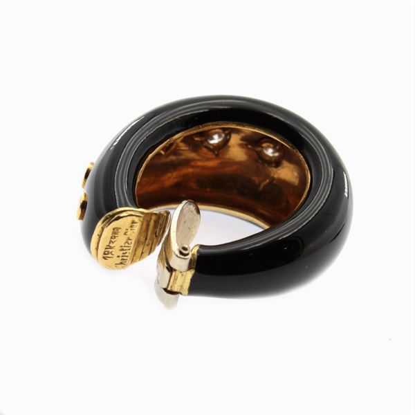 weight 40 gr.in 18kt yellow gold, black enamel set with brilliant-cut diamonds circa 1.30 ct, length 3 cm.