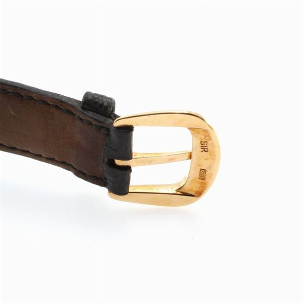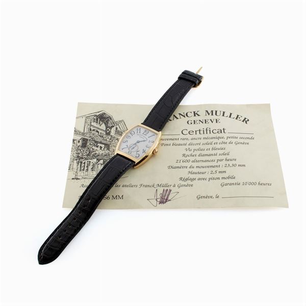 in 18kt yellow gold, ref. 7500 S6 MM, 38x28 mm case. silvered dial with Roman numerals, second counter at 6 o'clock, sapphire crystal, mechanical movement with manual winding, Peseux 700 caliber, leather strap with original 18kt yellow gold buckle,signd case, dial and movement, complete with certificate