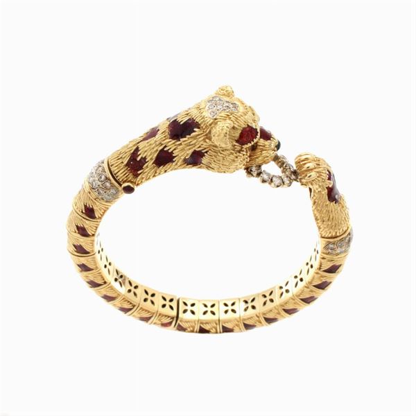 weight 84 gr.in 18kt yellow gold, red enamel and brilliant-cut diamonds circa 1.20 ct, snap closure, diameter 6 cm.
