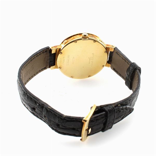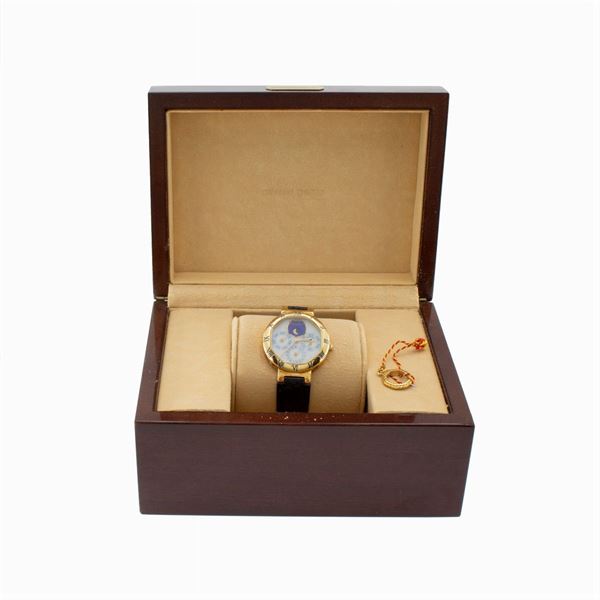 in 18kt yellow gold, ref. G29947 - 42451, 33 mm hexagonal case. bezel with Roman numerals, mother-of-pearl dial, three auxiliary dials for date, days, months and one in lapis lazuli for moon phases, faceted sapphire crystal, mechanical movement with automatic winding, 2504 caliber, leather strap with original 18kt yellow gold buckle, signed case, dial and movement, complete with box and key