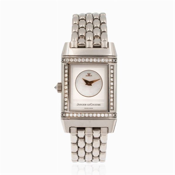 weight 101 gr.in 18kt white gold, ref. 266332440 - 1964353, 33x20 mm. rectangular case, on one side embellished with brilliant-cut diamonds, two duodial dials, one silvered and mother-of-pearl with indexes and Arabic numerals, the other guilloche and mother-of-pearl, sapphire crystal, crown with diamond, mechanical movement with manual winding, caliber 846/1, 18kt white gold bracelet with hidden folding clasp, signed case, dial and movement, complete with box, guarantee and additional link