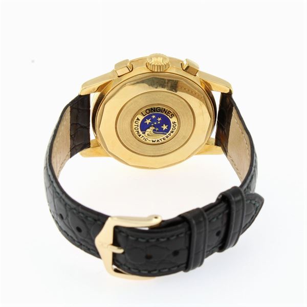 weight 85 gr.in 18kt yellow gold, ref. 7949650, 39 mm round case. silvered dial with indexes, three subdials for the chronograph, date display at 12 o'clock, mechanical movement with automatic winding, caliber L650.2, leather strap with golden metal buckle, siged case, dial and movement