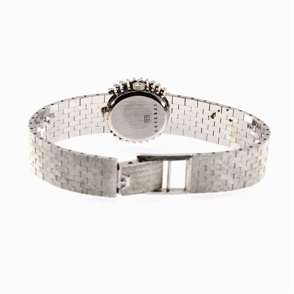 weight 41 gr.in 18kt white gold, ref. 0415039, oval case 22x18 mm. bezel with brilliant-cut diamonds circa 0.60 ct, silver dial with indexes, mechanical movement with manual winding, 18kt white gold bracelet, adjustable clasp, length 17.5 cm.