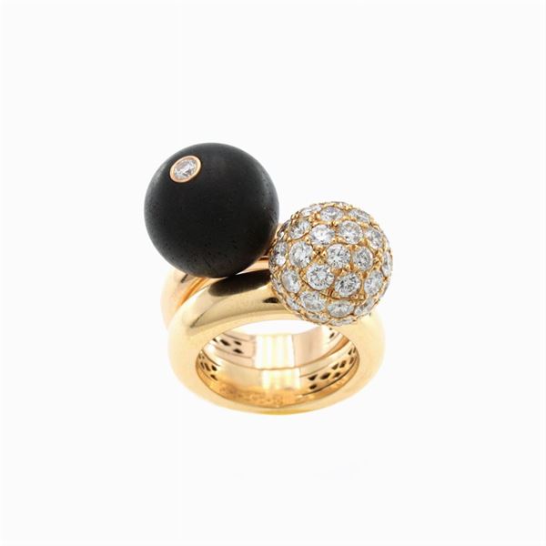 weight 25 gr.one sphere in yellow gold and brilliant-cut diamonds, circa 2.90 ct, the other sphere in ebony centered by a brilliant-cut diamond, size 12