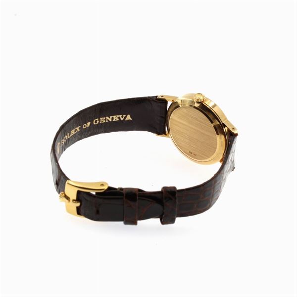 weight 24 gr.in 18kt yellow gold, ref. 4109 - 4356269, 26 mm round case. silver dial with indexes, sapphire crystal, mechanical movement with manual winding, caliber 1601, leather strap with original 18kt yellow gold buckle, signed case, dial and movement
