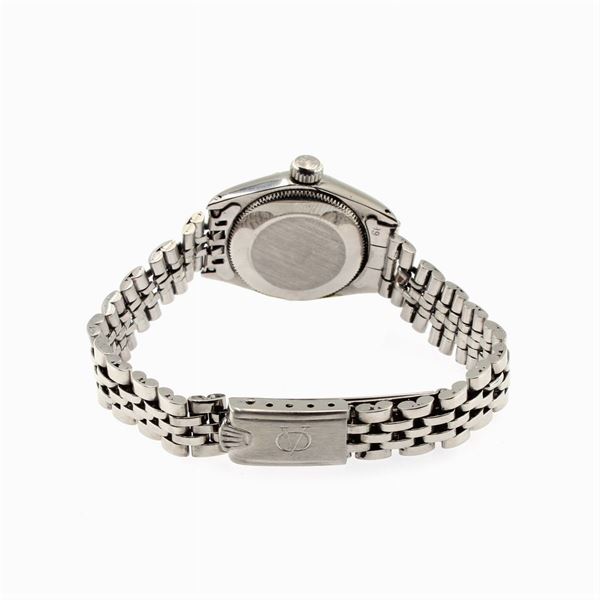 weight 39 g.in steel, ref. 6619- 2423419, 25 mm round case. white dial with Roman numerals, date display at 3 o'clock, mechanical movement with automatic winding, caliber 1161, steel jubilee bracelet with folding clasp, signed case, dial and movement