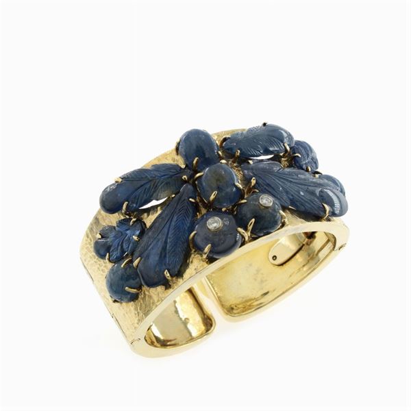 weight 81 gr.in 18kt yellow gold, engraved and cabochon-cut sapphires set with brilliant-cut diamonds, slight defects, snap closure with spring, diameter 5.5 cm.