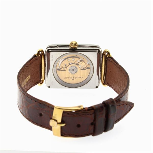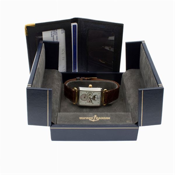 in steel and 18kt yellow gold, ref. 164-44 /1425, rectangular case 34x29 mm., complete calendar, silvered dial with indexes, four subsidiary dials, three in mother-of-pearl for date, days, months and moon phases, sapphire crystal, mechanical skeletal movement with automatic winding, 16-5 caliber, leather strap with original buckle, case, signed dial and movement, complete with box, guarantee and key