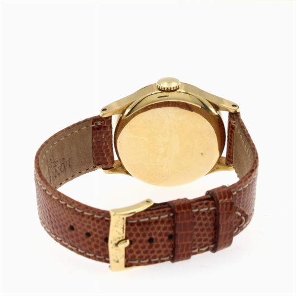 in 18kt yellow gold, ref. 258932 - 368236, 30 mm round case. black dial with indexes and Arabic numerals RISTAMPATO, second counter at 6 o'clock, mechanical movement with manual winding, leather strap with gold-plated buckle, CASSA E MOVIMENTO FIRMATI
