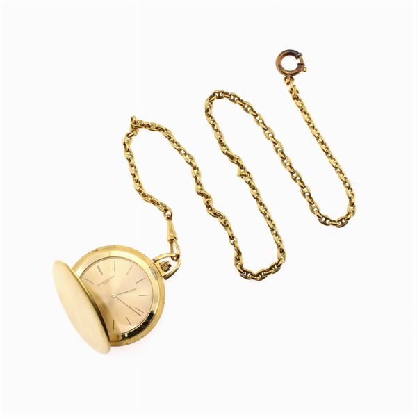 weight 70 gr.in 18kt yellow gold, ref. 7402 - 465342, double case 42 mm. champagne dial with indexes, manual winding mechanical movement, caliber 1003, signed case, dial and movement, complete with 18kt yellow gold watch chain