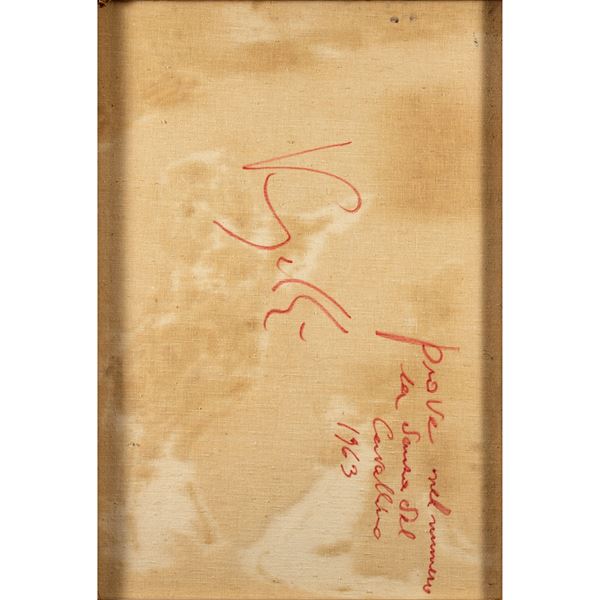 70x50 cm."Prove nel numero la danza del cavallino", 1963, oil on canvas, signed at the lower centre, signed, dated and titled on the back, framed