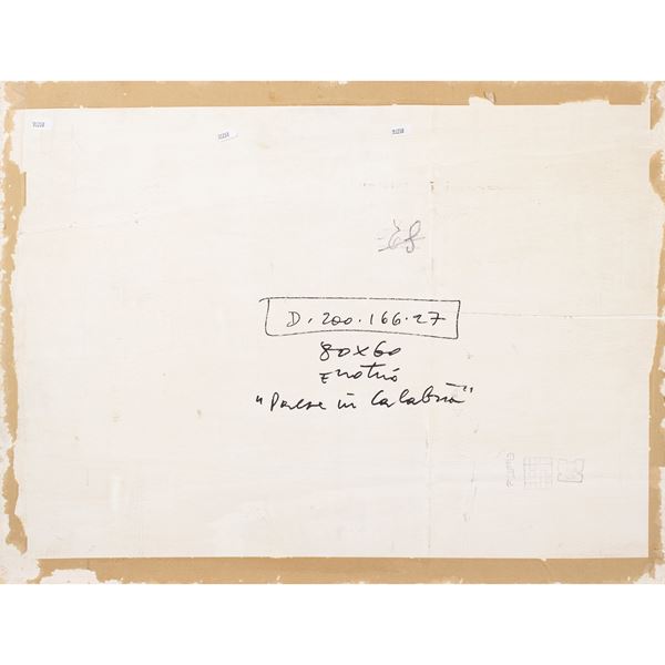 60x80 cm."Paese in Calabria", oil on plywood, signed lower left, signed and titled on the reverse