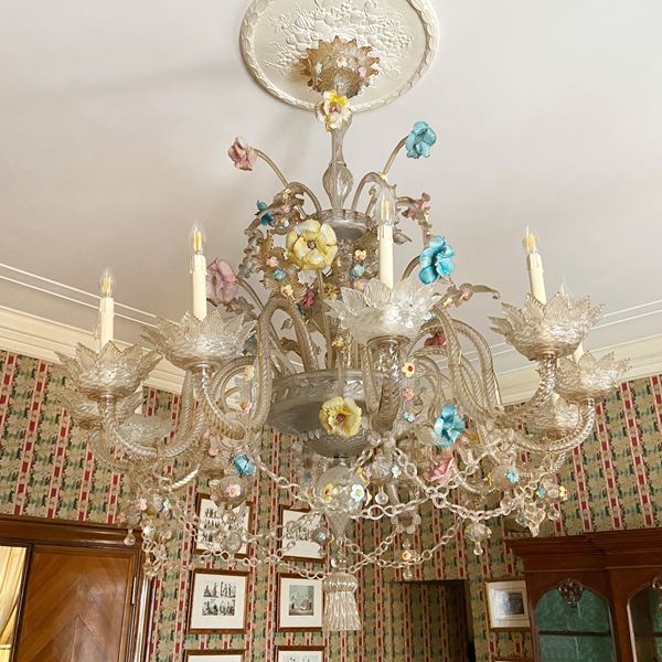 155x130 cm.shaped arms alternating with rich floral decorations in polychrome glass, slight defects